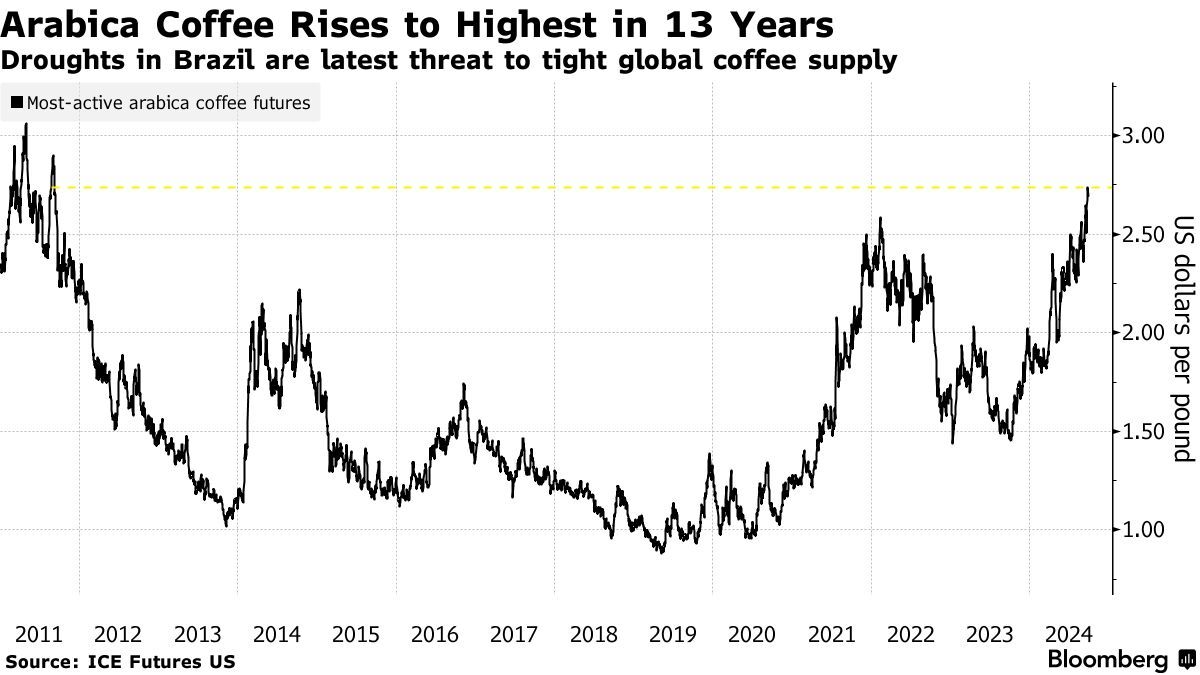 阿拉比卡咖啡豆的价格攀升至2011年以来的最高水平,通常较为便宜的罗布斯塔咖啡豆的价格也受到了恶劣天气的影响,现在几乎同样昂贵。越南的干旱、以及临近收获期的暴雨影响了主要咖啡种植地的产量。
