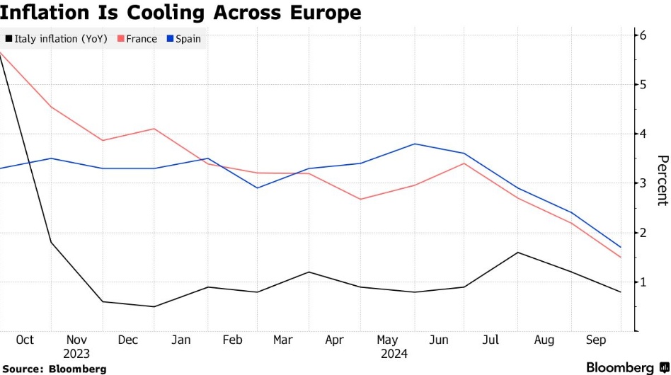 意大利的数据与欧元区20国整体通胀放缓的趋势一致,上周五公布的法国和西班牙数据跌破了欧洲央行2%的通胀目标水平。受此影响,投资者加大押注欧洲央行将在10月降息,为年内第三次下调借贷成本。