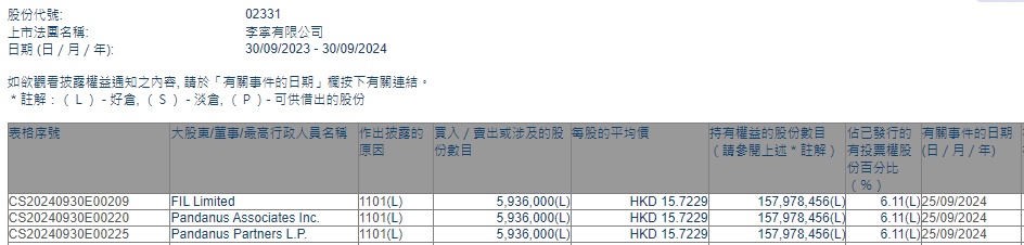 智通财经APP获悉,香港联交所最新资料显示,9月25日,富达国际增持李宁(02331)593.6万股,每股作价15.7229港元,总金额约为9333.11万港元。增持后最新持股数目约为1.58亿股,最新持股比例为6.11%。