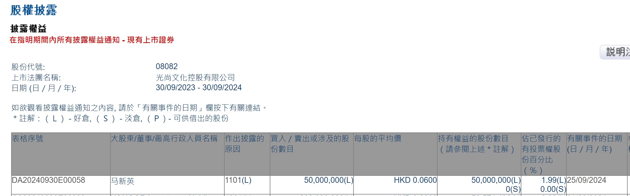 智通财经APP获悉,香港联交所最新资料显示,9月25日,非执行董事马新英增持光尚文化控股(08082)5000万股,每股作价0.06港元,总金额为300万港元。增持后最新持股数目为5000万股,最新持股比例为1.99%。