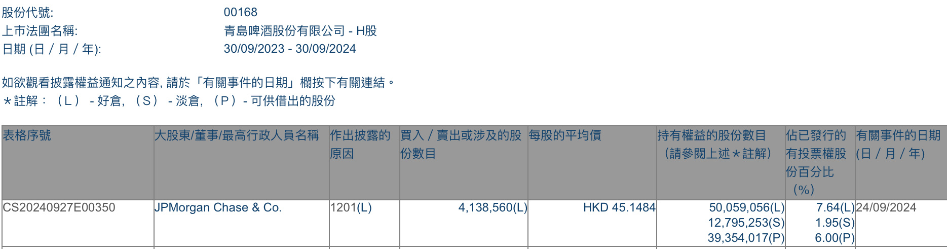 智通财经APP获悉,香港联交所最新资料显示,9月24日,小摩减持青岛啤酒股份(00168)413.856万股,每股作价为45.1484港元,总金额约1.87亿元港元。减持后最新持股数目约为5005.91万股,持股比例为7.64%。