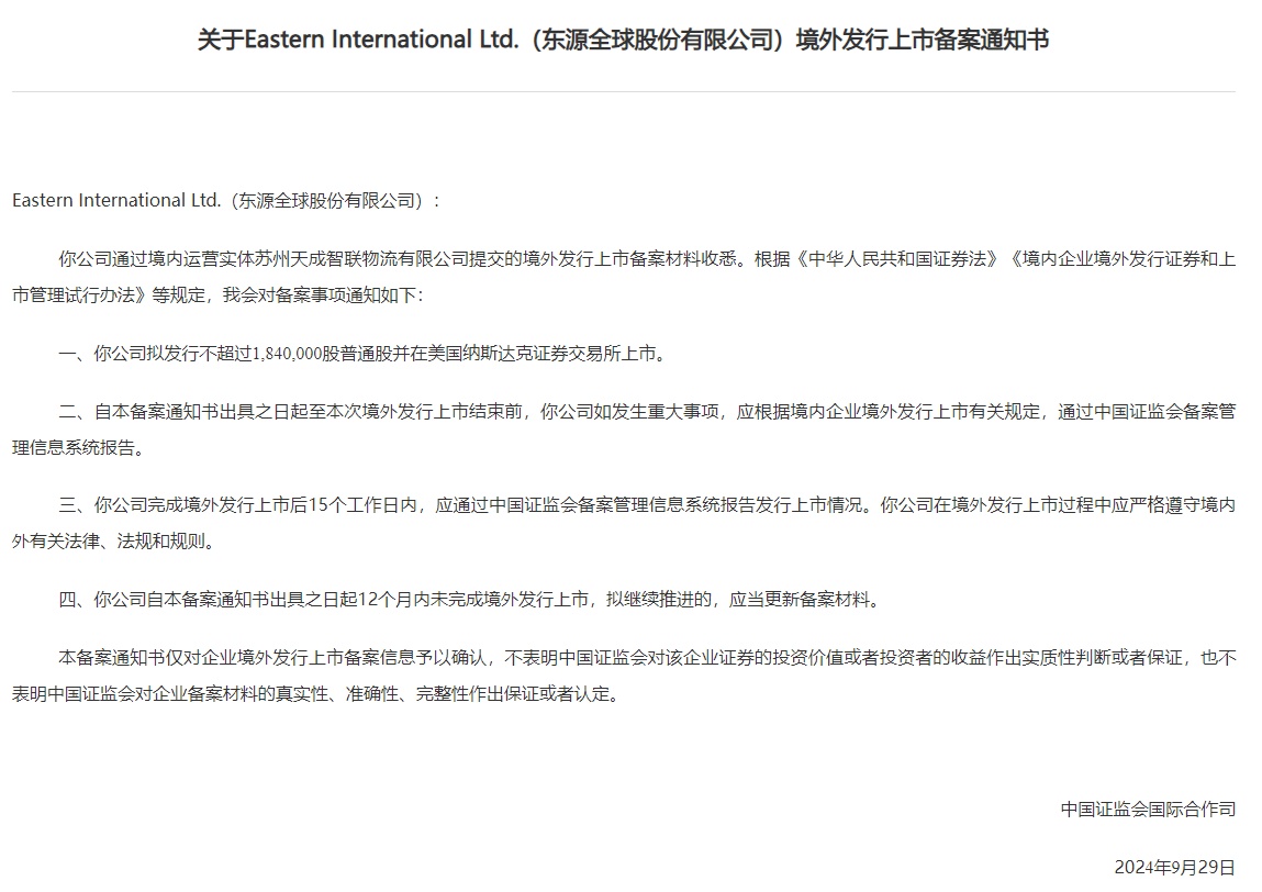 智通财经APP获悉,9月30日,中国证监会发布《关于Eastern International Ltd.(东源全球股份有限公司)境外发行上市备案通知书》。该公司通过境内运营实体苏州天成智联物流有限公司(简称:天成智联(ELOG.US))提交的境外发行上市备案材料已被中国证监会收悉,拟发行不超过184万股普通股并在美国纳斯达克证券交易所上市。