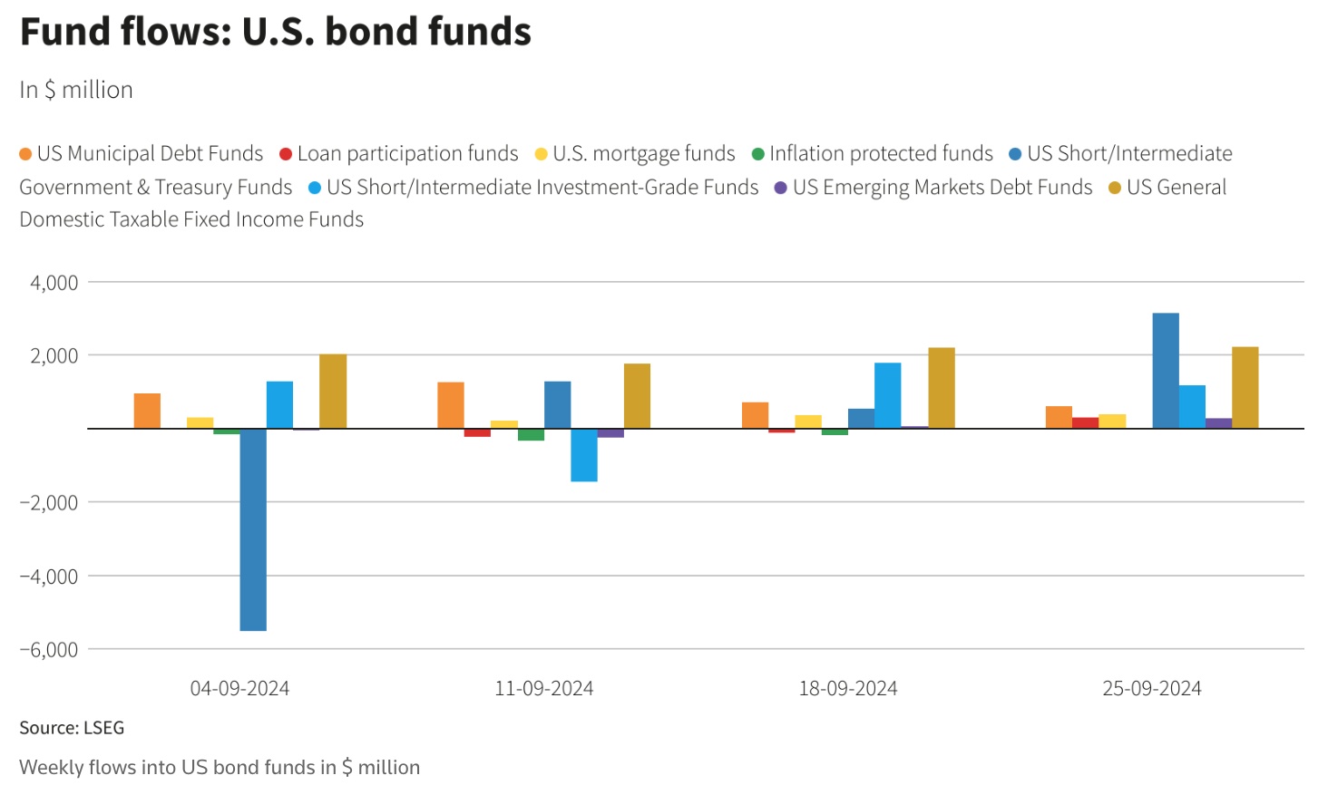 与此同时,美国债券基金在截至9月25日的一周内吸引了60亿美元的资金净流入,为连续第十七周实现资金净流入。其中,美国短期至中期国债基金吸引了约31.3亿美元的资金流入,为四周以来的最高水平。