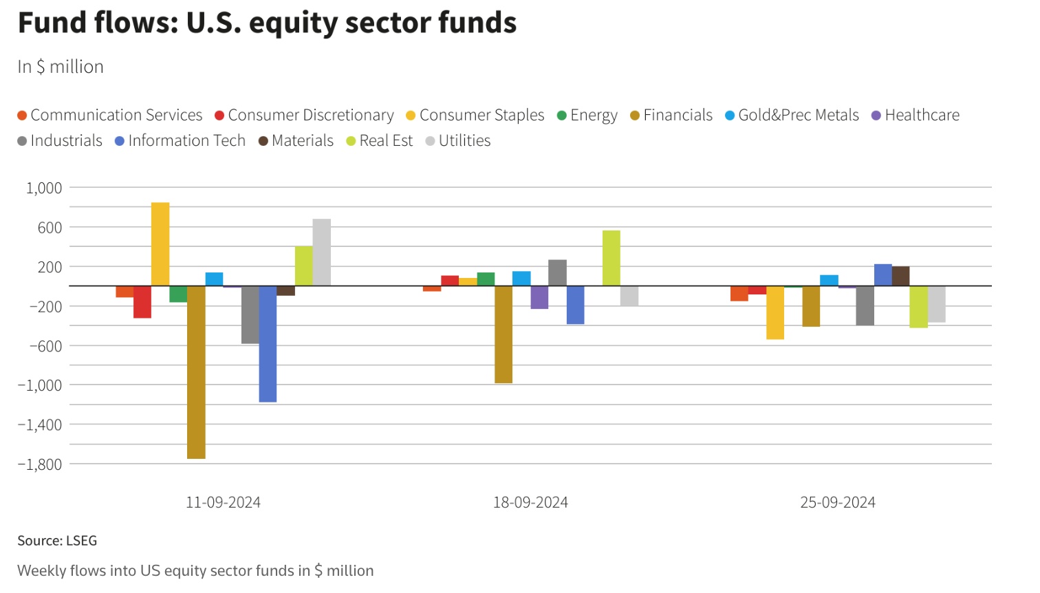 按行业划分,投资者从必需品类股撤出5.39亿美元,扭转了连续三周净买入的趋势;房地产、工业和金融类股各有大约4亿美元的资金流出。