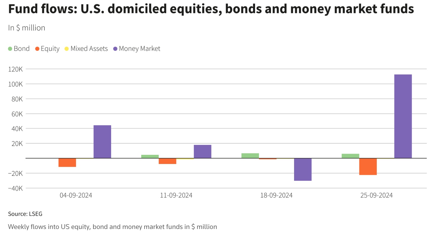 智通财经APP获悉,LSEG的数据显示,在截至9月25日的一周内,投资者抛售了价值224.3亿美元的美国股票基金,这是自2022年12月以来的最大单周净抛售,也是投资者连续第五周减持美国股票基金。这表明,投资者对美国经济状况的担忧挥之不去,且在美国总统大选前保持谨慎。