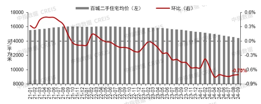 图:2021年1月至2024年9月百城二手住宅价格及环比变化