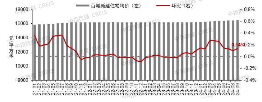 图:2021年1月至2024年9月百城新建住宅价格及环比变化