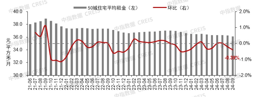 图:2021年6月至2024年9月50城住宅平均租金及环比变化