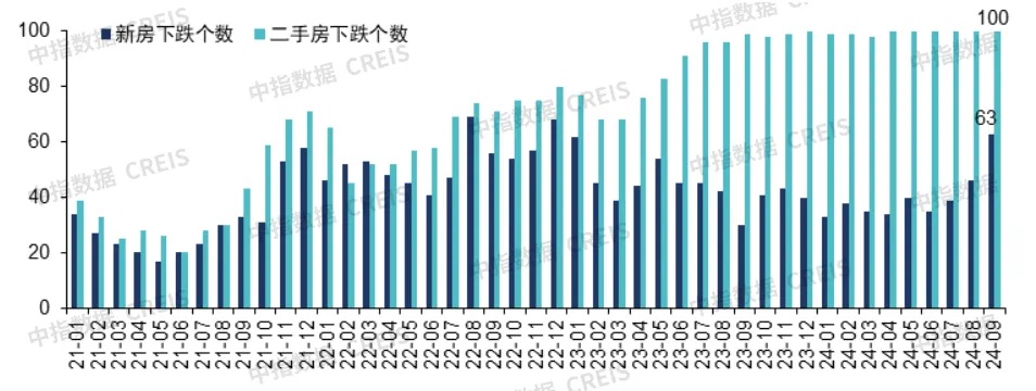 图:2021年1月至2024年9月百城新建及二手住宅价格环比下跌城市数量