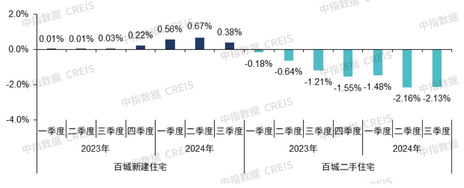 图:2023年-2024年三季度百城新建住宅、二手住宅价格季度累计涨跌变化