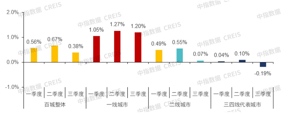 图:2024年一至三季度各梯队城市新建住宅价格季度累计涨跌变化