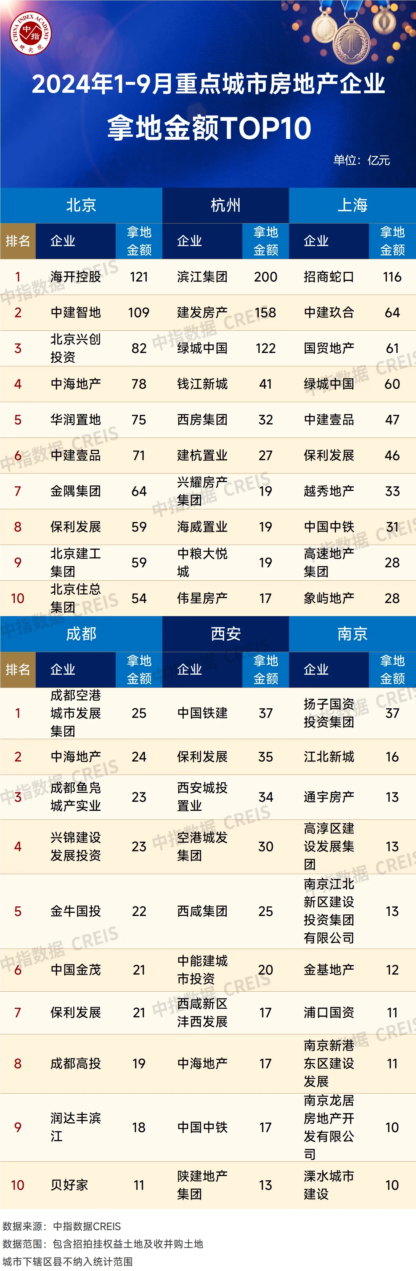 智通财经APP获悉,中指研究院发文称,2024年1-9月,TOP100企业拿地总额5324亿元,同比下降38.1%,受上年低基数影响,相较1-8月降幅收窄1.9个百分点。今年以来,全国土地市场延续低温运行态势,政府推地、房企拿地信心均不足,土地供求两端持续缩量。根据初步统计,2024年前三季度,全国300城住宅用地供求规模同比降幅均在三成以上,土地出让金降幅超四成,三季度同比降幅略有收窄。土拍方面,房企拿地战线收缩下,仅部分热点城市优质地块房企参拍积极,但底价出让仍是多数城市土拍常态,前三季度300城成交楼面均价同比下降13.3%,溢价率较去年同期下降0.7个百分点,拿地企业仍集中在央国企和地方国资。