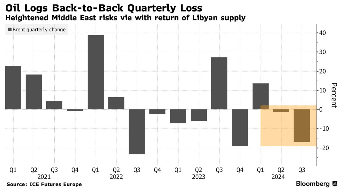 智通财经APP注意到,由于中东地缘政治风险(以色列开始在黎巴嫩境内发动地面袭击)与利比亚恢复供应的前景相互影响,油价在第四季度初企稳。