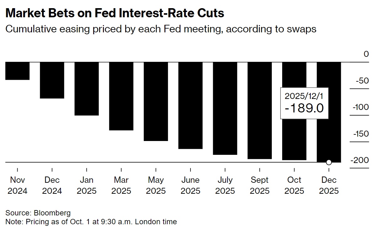 货币市场暗示,美联储在11月再次降息50个基点的可能性为三分之一,预计到明年年底将降息约190个基点。但芬克表示,他很难看到这种情况成为现实,因为目前大多数政府政策的通胀作用大于通缩作用。