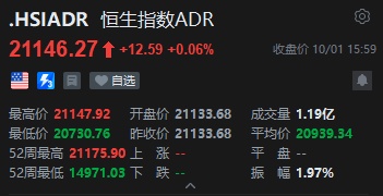 智通财经APP获悉,周二美股三大指数下跌,恒生指数ADR上涨,按比例计算,收报21146.27点,较香港收市涨12.59点或0.06%。