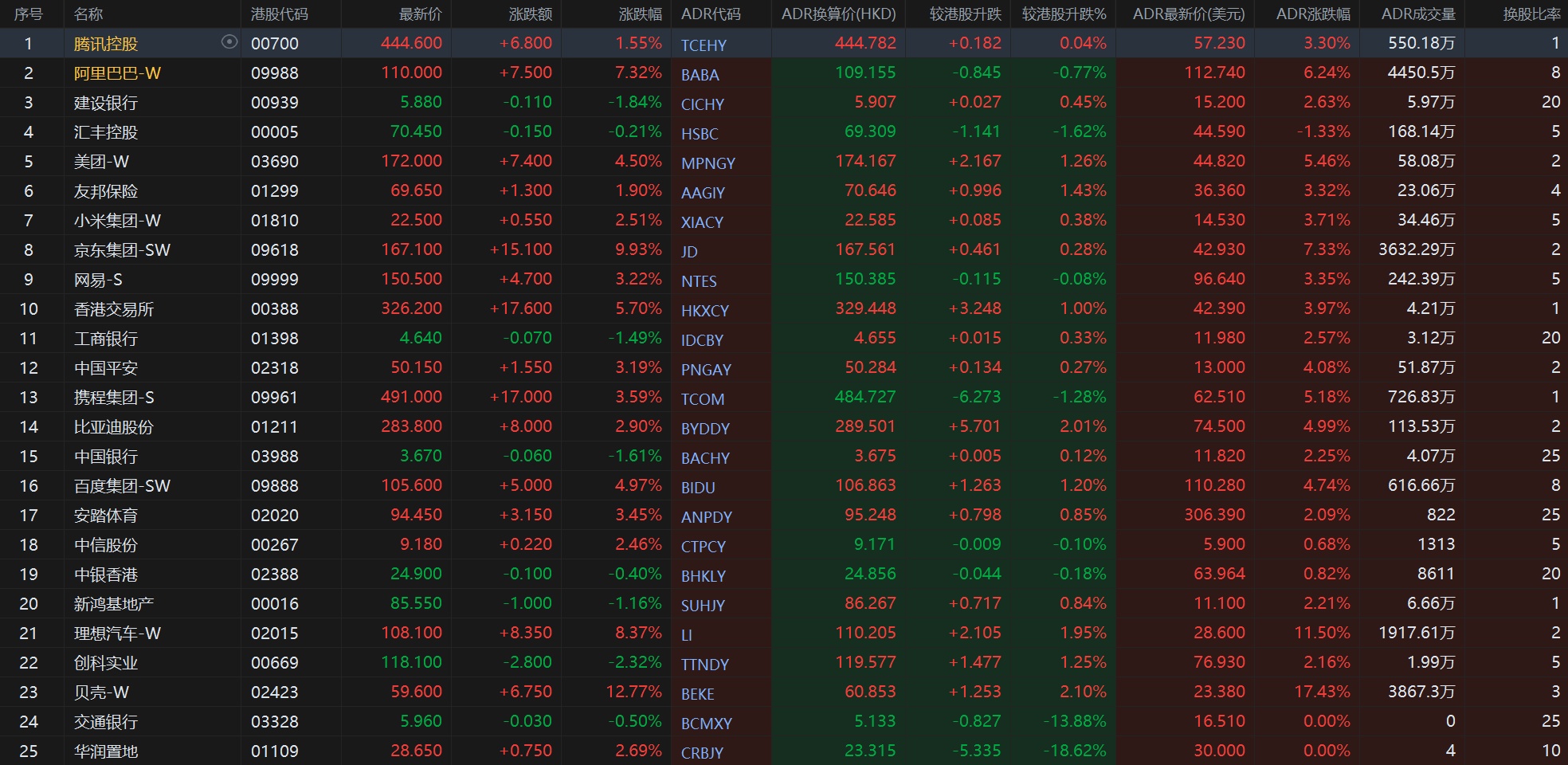 大型蓝筹股涨跌不一,汇丰控股收报69.309港元,较香港收市跌1.62%;腾讯控股收报444.782港元,较香港收市涨0.04%。