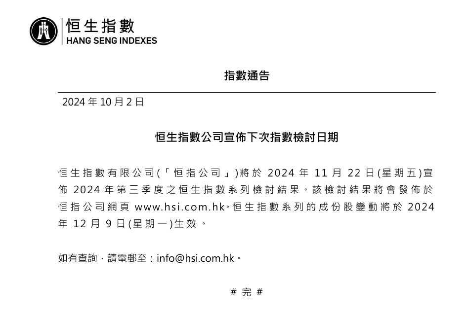 智通财经APP获悉,10月2日,恒生指数有限公司(恒指公司)发布通告,恒指公司将于2024年11月22日(星期五)宣布2024年第三季度之恒生指数系列检讨结果。该检讨结果将会发布于恒指公司网页www.hsi.com.hk。恒生指数系列的成份股变动将于2024年12月9日(星期一)生效。
