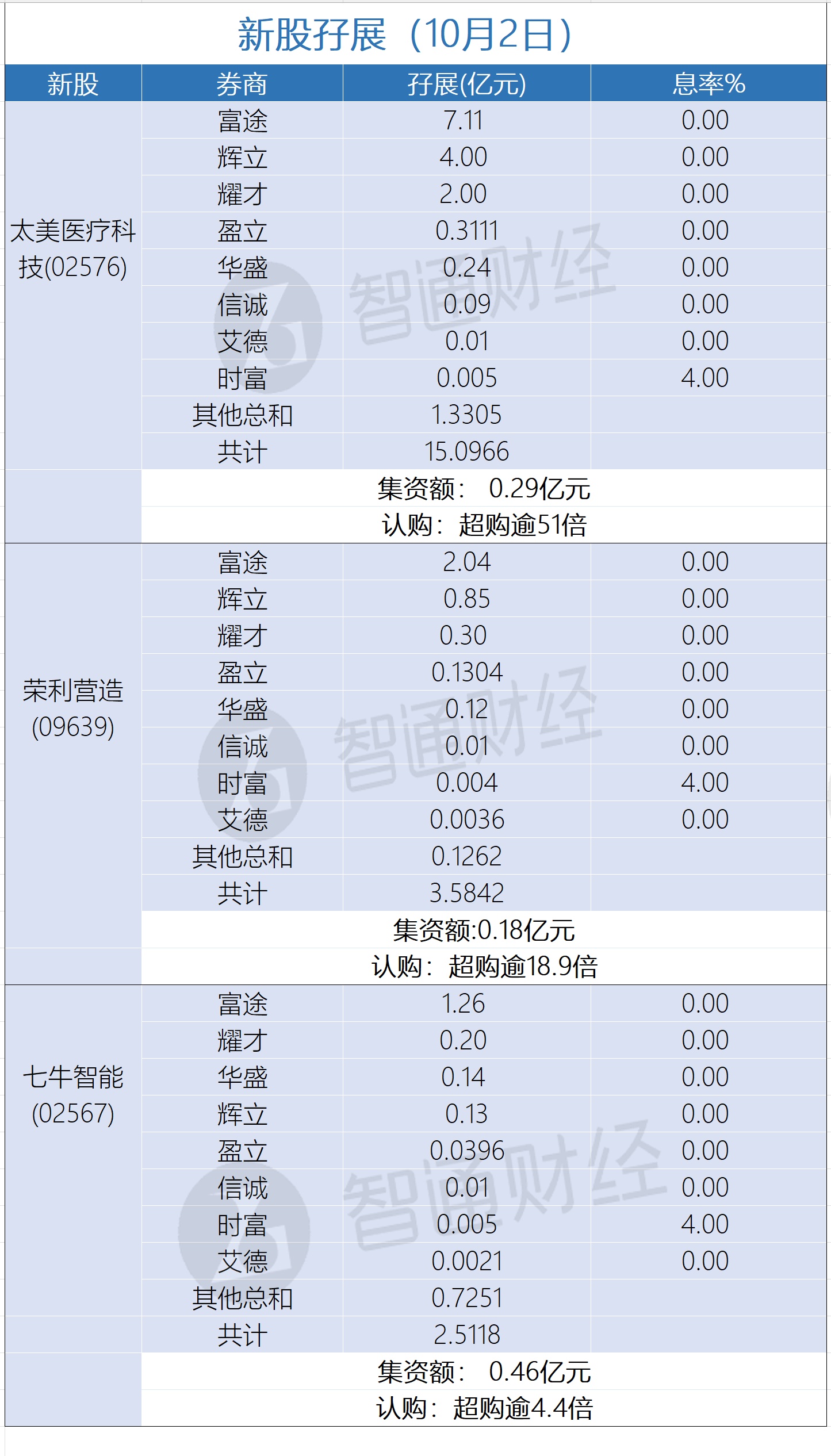 智通财经APP获悉,太美医疗科技(02576)、荣利营造(09639)、七牛智能(02567)正在招股中。截至10月2日,辉立、华盛等券商合计为太美医疗科技借出15.0966亿港元,超购逾51倍;合计为荣利营造借出3.5842亿港元,超购逾18.9倍;合计为七牛智能借出2.5118亿港元,超购逾4.4倍。