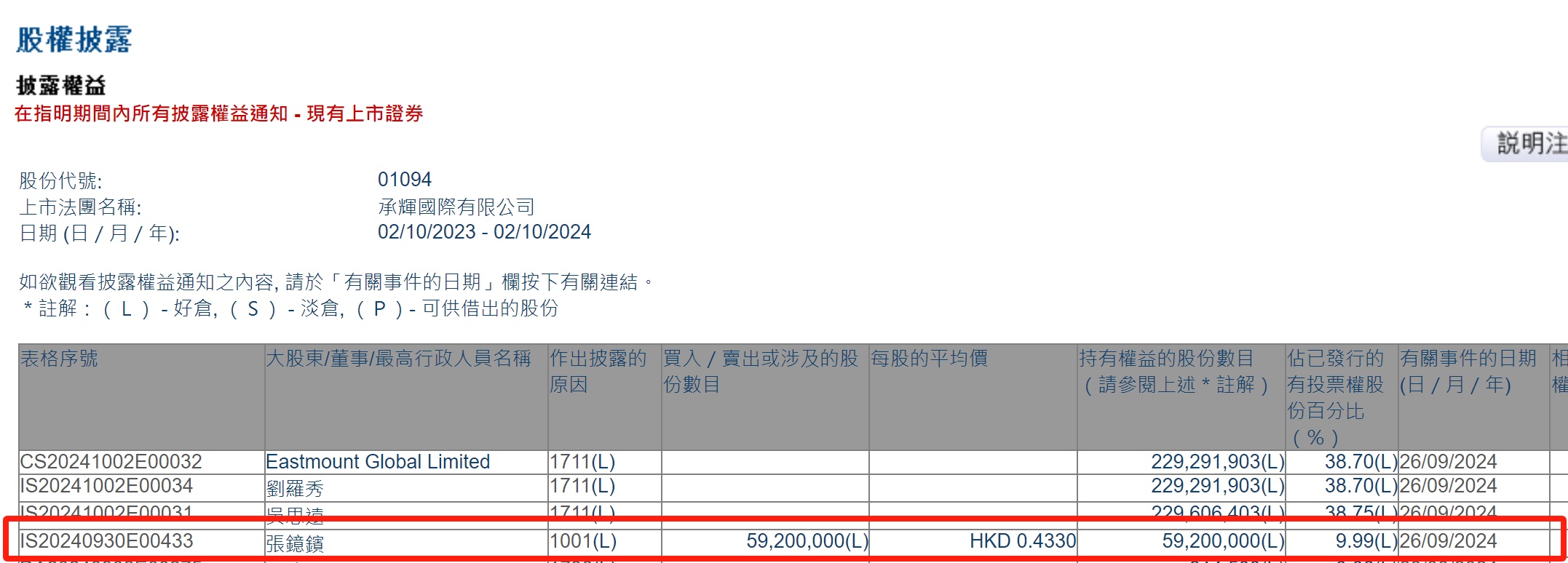 智通财经APP获悉,香港联交所最新资料显示,9月26日,张镱镔增持承辉国际(01094)5920万股,每股作价0.433港元,总金额约为2563.36万港元。增持后最新持股数目为5920万股,最新持股比例为9.99%。