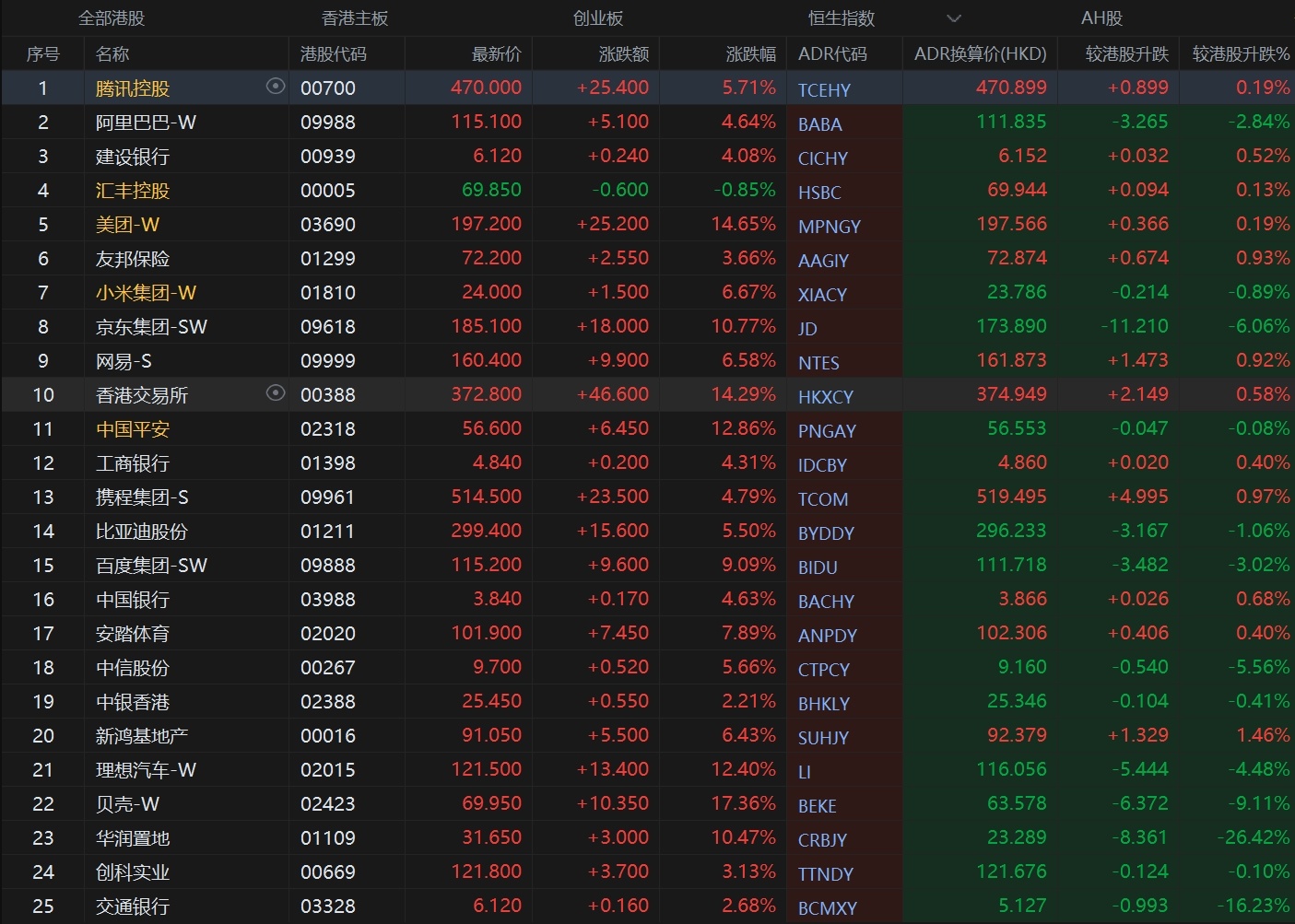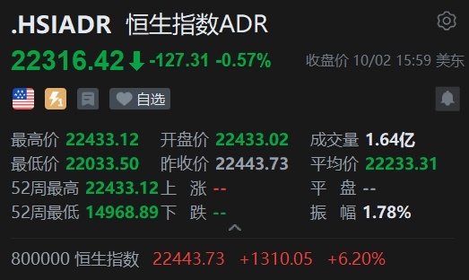 智通财经APP获悉,周三美股三大指数集体收涨,恒生指数ADR下跌,按比例计算,收报22316.42点,较香港收市下跌127.31点或0.57%。