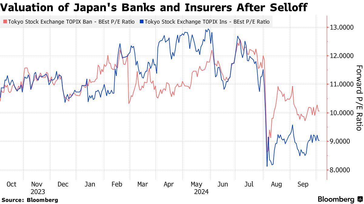 数据显示,日本银行和保险公司的估值在8月初日本股市遭遇大规模抛售后有所下降,东证保险指数和银行指数的预期市盈率分别为9倍和10.1倍,均低于7月初这两项指数触及历史高点时的预期市盈率(分别为12.1倍和12.4倍)。