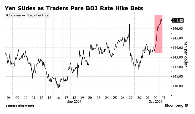 周四,日元在亚洲市场延续跌势,一度跌至147.24,为8月20日以来的最低水平。