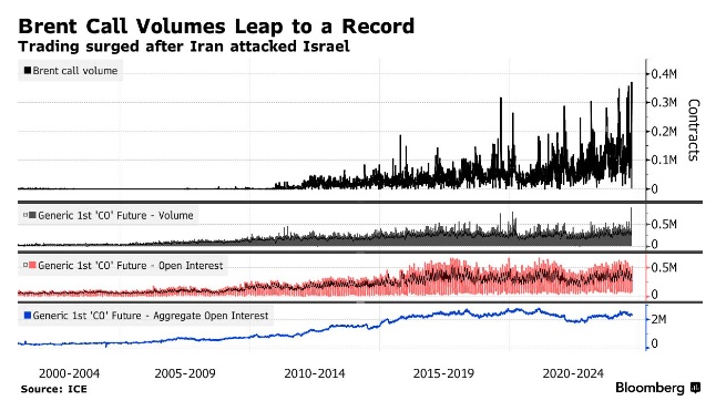 期权市场的行为与期货合约的收益相对应。由于中东爆发全面战争可能会扰乱石油生产和运输,油价正在上涨。自伊朗本周早些时候向以色列发射了100多枚弹道导弹以来,布伦特原油价格上涨了约4%。一项衡量全球石油价格基准隐含波动率的指标已跃升至近一年来的最高水平。