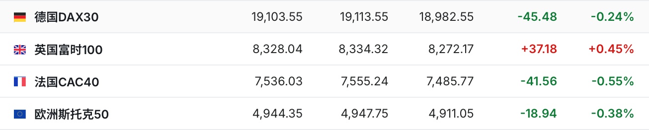 2. 截至发稿,德国DAX指数跌0.24%,英国富时100指数涨0.45%,法国CAC40指数跌0.55%,欧洲斯托克50指数跌0.38%。
