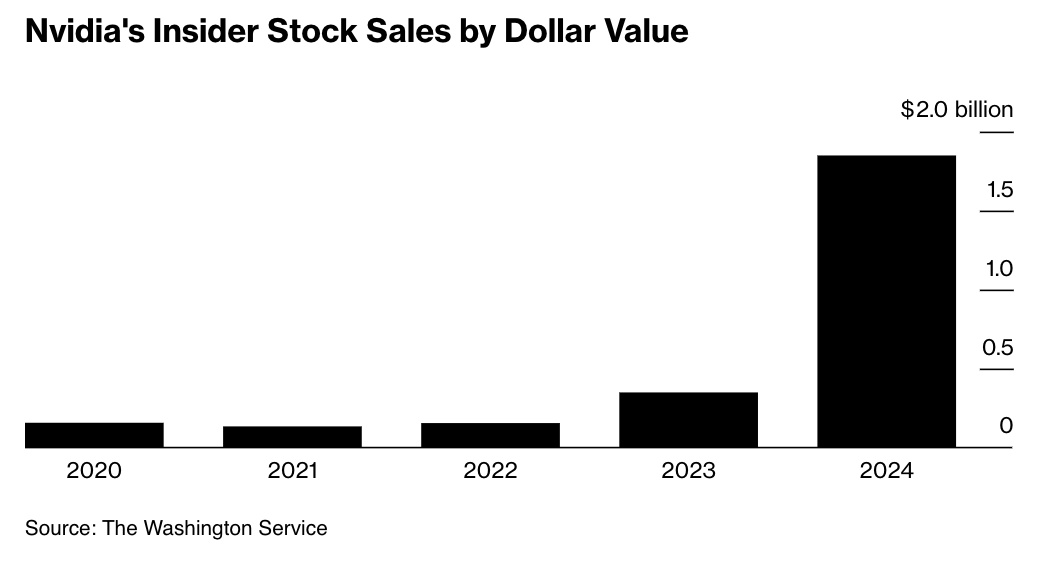 智通财经APP获悉,今年到目前为止,英伟达(NVDA.US)内部人士已经套现价值超18亿美元的股票,而且更多的抛售即将到来。根据Washington Service汇编的数据,英伟达高管和董事在2024年出售了近1100万股英伟达股票,这是自2020年以来最多的一年。