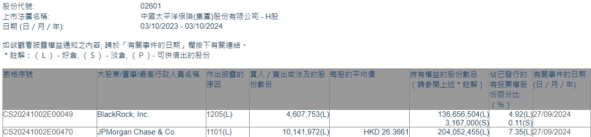 智通财经APP获悉,香港联交所最新资料显示,9月27日,摩根大通增持中国太保(02601)1014.1972万股,每股作价26.3661港元,总金额约为2.67亿港元。增持后最新持股数目约为2.04亿股,最新持股比例为7.35%。