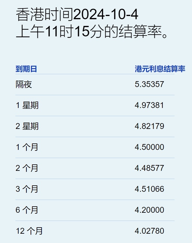 智通财经APP获悉,港元拆息今日个别发展。其中,隔夜息微升至5.35357%;一周拆息微降至4.97381%;而与楼按相关的一个月拆息亦连升十天,报4.5%,是7月31日后最高。