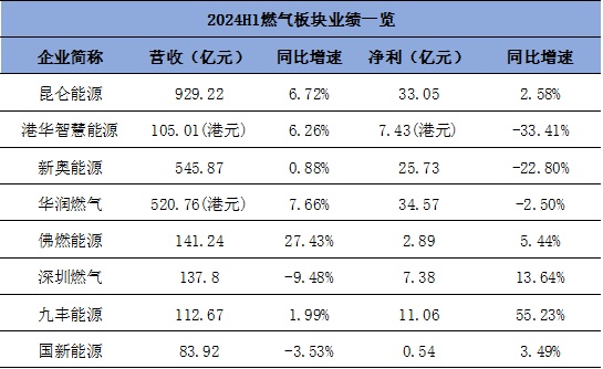 行业层面来看,上半年国内天然气消费情况较好,带动城燃企业业绩表现向好,头部企业销气量普遍实现增长。其中,昆仑能源、华润燃气(01193)天然气销售业务收入及涨幅居前,分别同比增长9.74%、11.37%,达766.6亿元、459.24亿港元;港华智慧能源、新奥能源(02688)管道燃气销售业务分别同比增长5.04%、3%,达86.72亿港元、300.85亿元。
