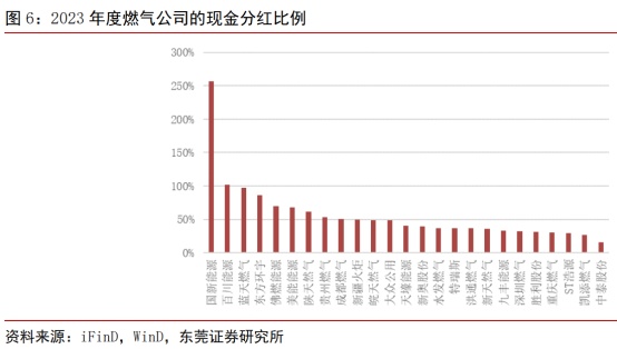 而从投资层面来看,燃气板块普遍具备业绩稳健、现金流强劲及高分红的特征,长期配置价值凸显。根据东莞证券统计,据2023年度权益分派实施公告等公司资料,31家燃气行业上市公司中有26家通过现金分红的方式回报股东,其中国新能源(600617.SH)、百川能源(600681.SH)、蓝天燃气(605368.SH)、东方环宇(603706.SH)、佛燃能源(002911.SZ)的现金分红比例更是超七成。