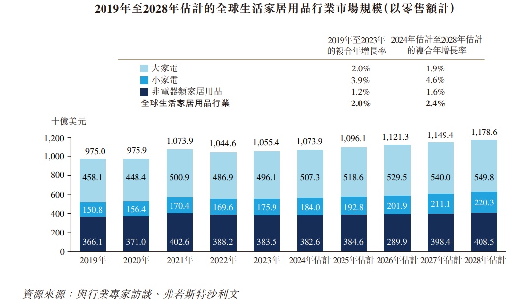 根据弗若斯特沙利文的资料,以零售额计算,2023年全球生活家居用品行业的市场规模为10,554亿美元,2019年至2023年复合年增长率为2%,整体行业规模处于稳增长状态。