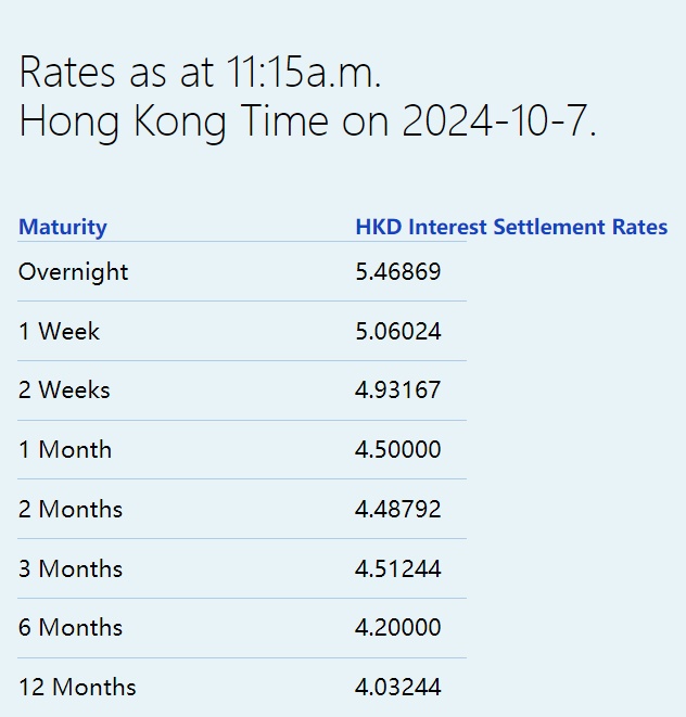 智通财经APP获悉,10月7日,港元拆息普遍上扬,其中,隔夜息涨11基点至5.46869%,一周拆息重上5%;但与楼按相关的一个月拆息十连升后,今日维持4.5%。