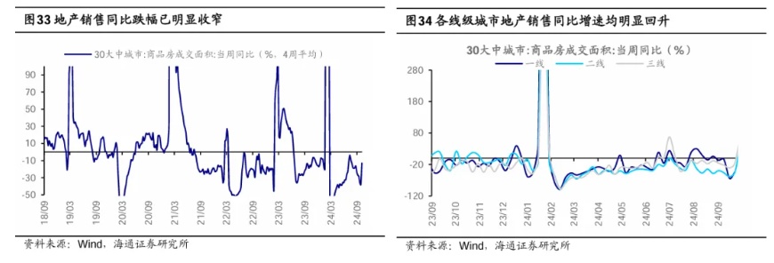 催化剂-地产:政策发力,房地产市场“止跌回稳”,估值修复。目前地产供需两端均在调整中,同时房价自21年也持续处于下跌趋势。基本面承压、房价持续下跌加剧了市场对地产板块的担忧,地产估值持续下行。924以来地产政策频出,926政治局会议明确提出要促进房地产市场“止跌回稳”。后续地产收储或加大力度,包括大城市在内的限购政策也可能调整,这有望推动地产基本面逐渐企稳。近期需求侧政策已逐渐出台,一线城市北上广深先后发布地产优化政策,其中广州已全面取消限购。在政策提振下,近期地产估值快速修复,房地产PB估值已从9/23的0.6倍上升至9/30的0.8倍。未来随着财政加力推动地产加速收储,地产基本面及房价或有望止跌回稳,市场对地产板块的担忧可能逐步缓解,推动估值进一步修复。最新高频数据显示30大中城市地产销售当周同比增速已明显回升,截至24/10/5,30大中城市中一线、二线、三线城市商品房成交面积当周同比增速分别为129%、49%、80%,均较前值的-43%、-45%、-16%大幅回升。