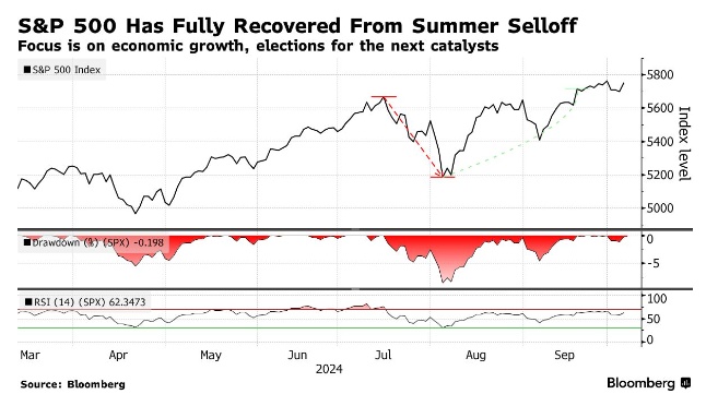 由于对经济衰退的担忧减弱以及美联储放松政策,美股在夏季遭遇抛售后持续反弹。根据掉期数据,交易员预计美联储在明年5月前将再降息100个基点。上周五公布的就业数据远强于预期,也提振了市场情绪。