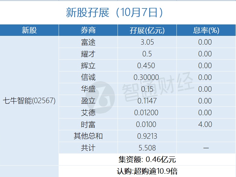 智通财经APP获悉,七牛智能(02567)正在招股中。截至10月7日,辉立、华盛等券商合计为七牛智能借出5.508亿港元,超购逾10.9倍。