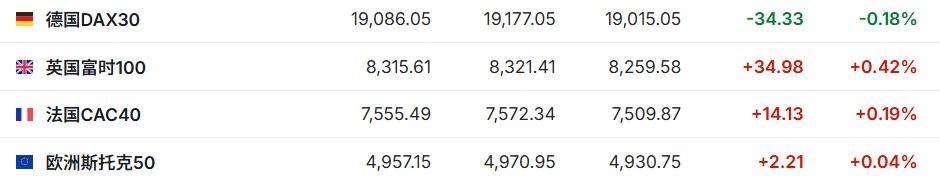2. 截至发稿,德国DAX指数跌0.18%,英国富时100指数涨0.42%,法国CAC40指数涨0.19%,欧洲斯托克50指数涨0.04%。