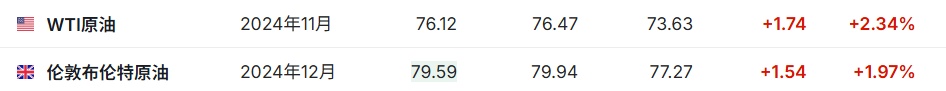 3. 截至发稿,WTI原油涨2.34%,报76.12美元/桶。布伦特原油涨1.97%,报79.59美元/桶。