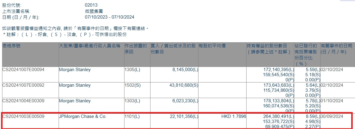 智通财经APP获悉,香港联交所最新资料显示,9月30日,摩根大通增持微盟集团(02013)2210.1356万股,平均每股作价1.7896港元,总金额约为3955.26万港元。增持后最新持股数目约为2.64亿股,持股比例为8.59%。