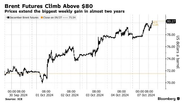 智通财经APP获悉,布伦特原油价格飙升至每桶80美元以上,为8月以来的最高水平,原因是中东地区日益紧张的局势引发了人们对以色列可能袭击伊朗石油基础设施的猜测。
