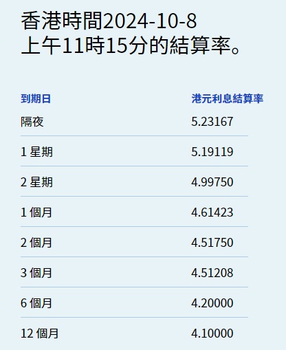 不过,隔夜息回落23基点至5.23167%,反映银行资金成本的三个月拆息结束十连升,微跌至4.51208%。长息方面,六个月期维持4.2%,而一年期则升至4.1%。