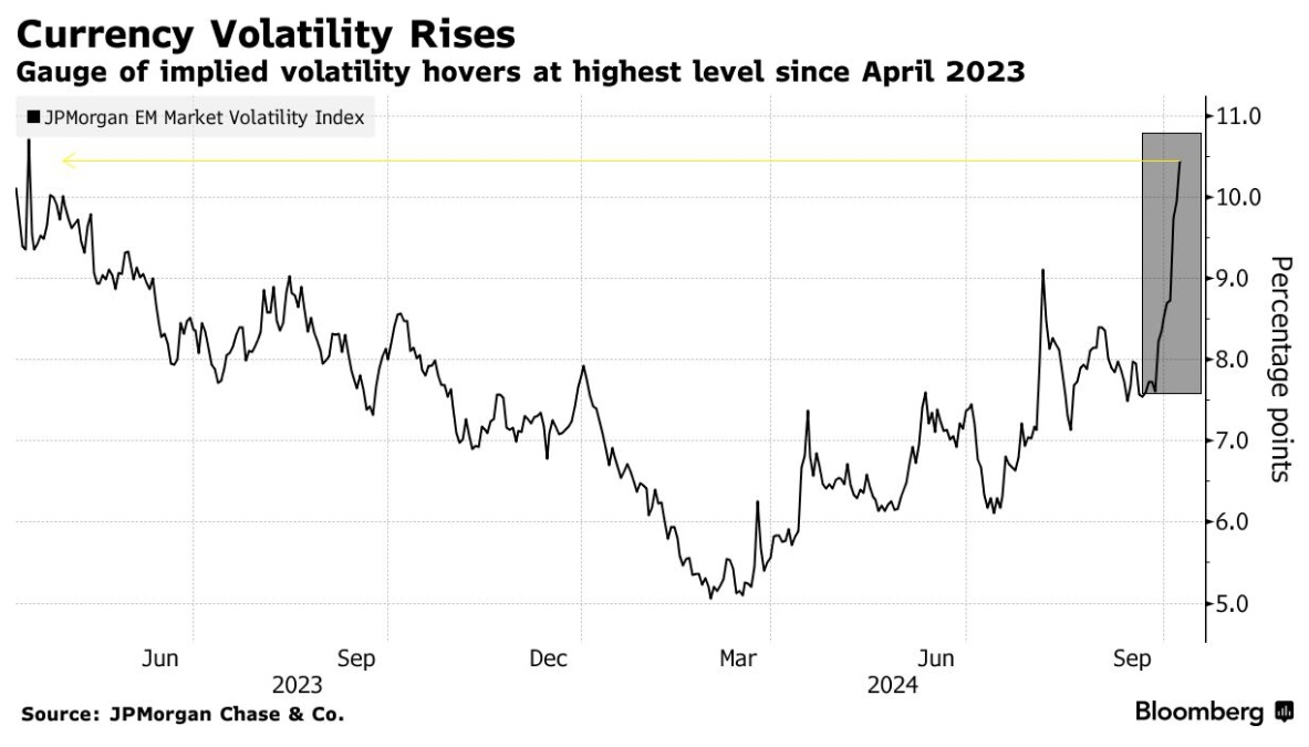 摩根大通衡量未来汇率波动的指标周一升至逾10个百分点,为2023年5月以来的最高水平。与七国集团类似汇率波动指标的差距扩大至6月初以来最大。MSCI新兴市场货币指数连续第五个交易日下跌,创下自去年7月以来最长的连跌纪录。