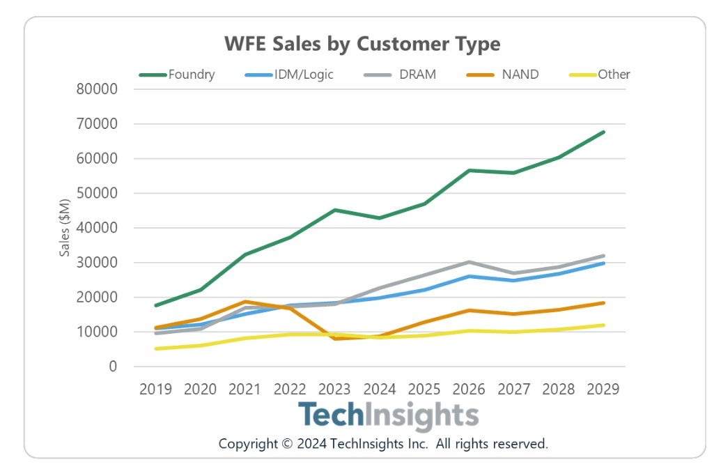 智通财经APP获悉,TechInsights发布的2024年Q2晶圆厂设备(WFE)按应用分类更新报告显示,存储器细分市场持续增长,2024年预计增幅达21%。在这一类别中,DRAM预计将领跑,增幅为26%,而NAND的增幅则较为温和,预计为9%。IDM/逻辑芯片领域预计增长8%。然而,代工厂和其他领域的预期降幅分别为5%和10%。展望2025年,存储器增长预期被下调至25%,而代工厂领域预计将迎来反弹,增幅为10%,IDM/逻辑芯片领域预计增长12%。