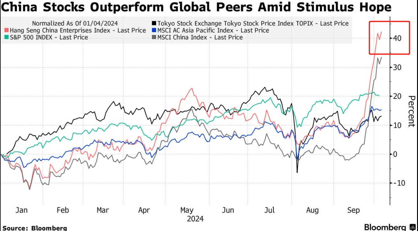 自9月24日以来,中国政府推出一揽子刺激举措提振中国经济,同时为国内金融市场提供无比强大的流动性支持,并且力争在债务危机的阵痛中重振国内持续萎靡的房地产行业,这一揽子政策全面提振全球投资者对于港股以及A股市场的信心。据了解,香港股票市场基准指数——恒生指数在截至10月7日的过去一个月内上涨了 35% 以上,一举成为同期今年全球 90 多个股票指数中表现最好的基准股指。