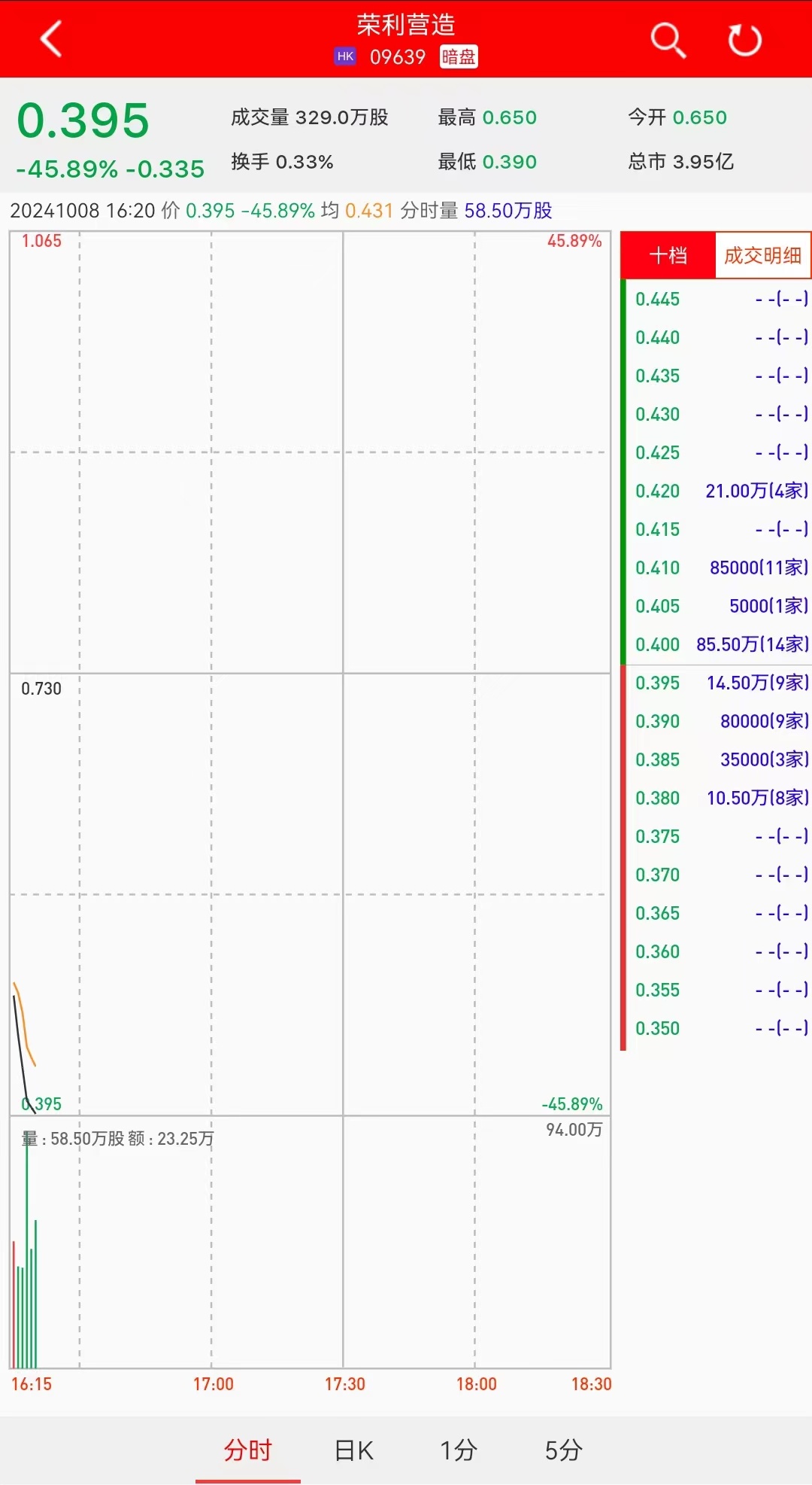 智通财经APP获悉,荣利营造(09639)将于10月9日(周三)在香港挂牌。截至发稿,利弗莫尔证券暗盘交易显示报价0.395港元,较招股价0.730港元下跌45.89%;每手5000股,不计手续费,每手亏1675港元。