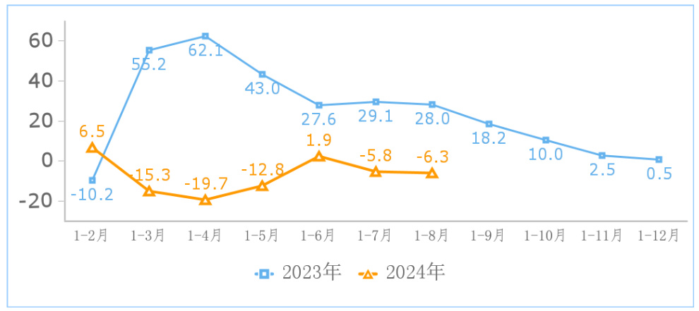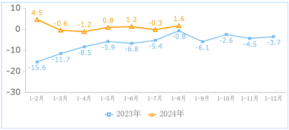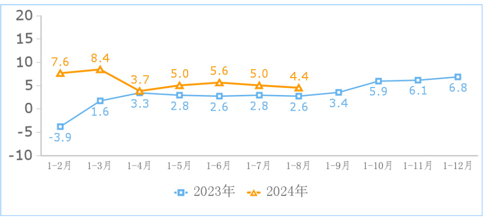 网络销售领域企业收入降幅扩大。1-8月份,主要提供网络销售服务的企业(包括大宗商品、农副产品、综合电商、医疗用品、快递等)互联网业务收入同比下降8.9%,降幅较1-7月扩大4.2个百分点。