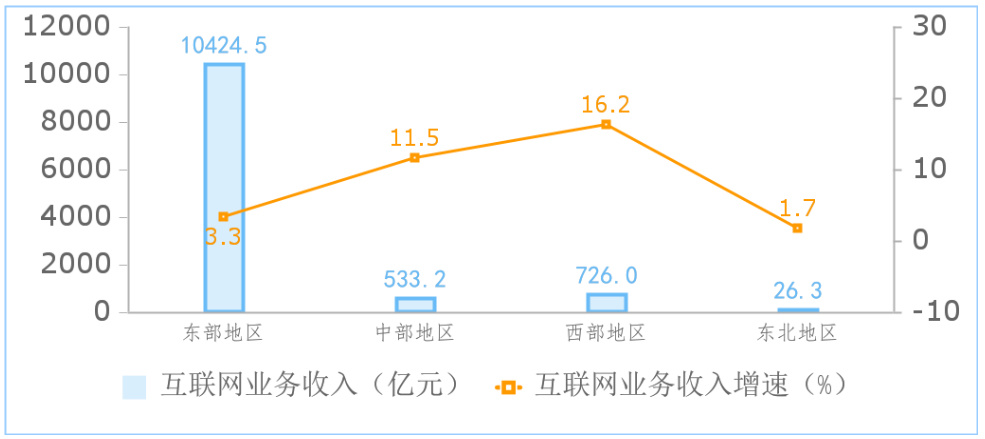 中部地区互联网业务收入保持增长势头。1-8月份,东部地区完成互联网业务收入10424亿元,同比增长3.3%,低于全国增速1.1个百分点,占全国互联网业务收入的89%。中部地区完成互联网业务收入533.2亿元,同比增长11.5%,高于全国增速7.1个百分点。西部地区完成互联网业务收入726亿元,同比增长16.2%。东北地区完成互联网业务收入26.3亿元,同比增长1.7%。