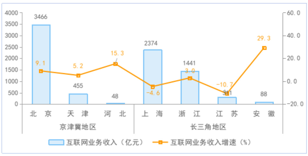 京津冀地区互联网业务收入稳步提升。1-8月份,京津冀地区完成互联网业务收入3969亿元,同比增长8.7%,占全国互联网业务收入的33.9%。长三角地区完成互联网业务收入4214亿元,同比下降2.1%,占全国互联网业务收入的36%。